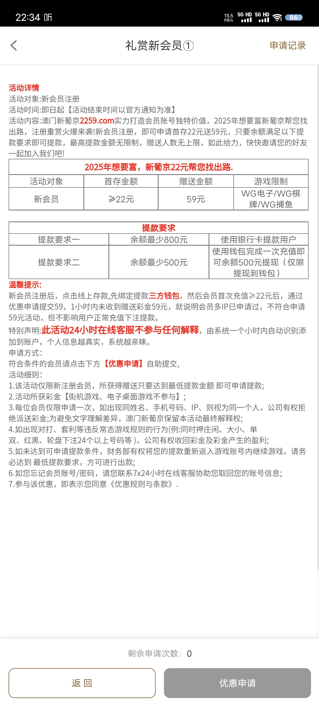2259 新账号充值22送59 5倍水 亲测提现秒到