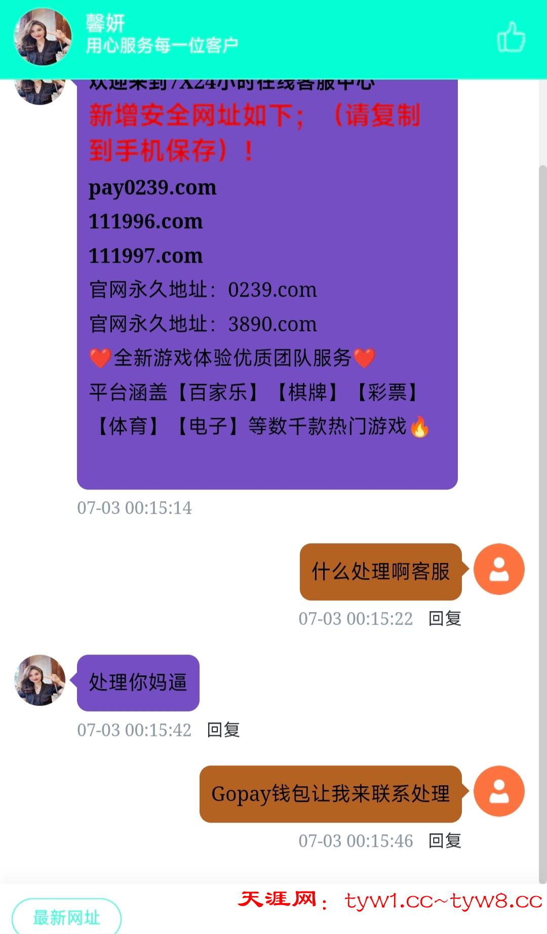 这个平台这两天才玩的,前面提现一千 两千都给了,就是昨天上了差不多一千提两千直接给我空汇了,提现显示成功Go没有收到币,问平台客服直接开骂了,每次赢个一千就提给平台整破防了。3890.com 0239.com