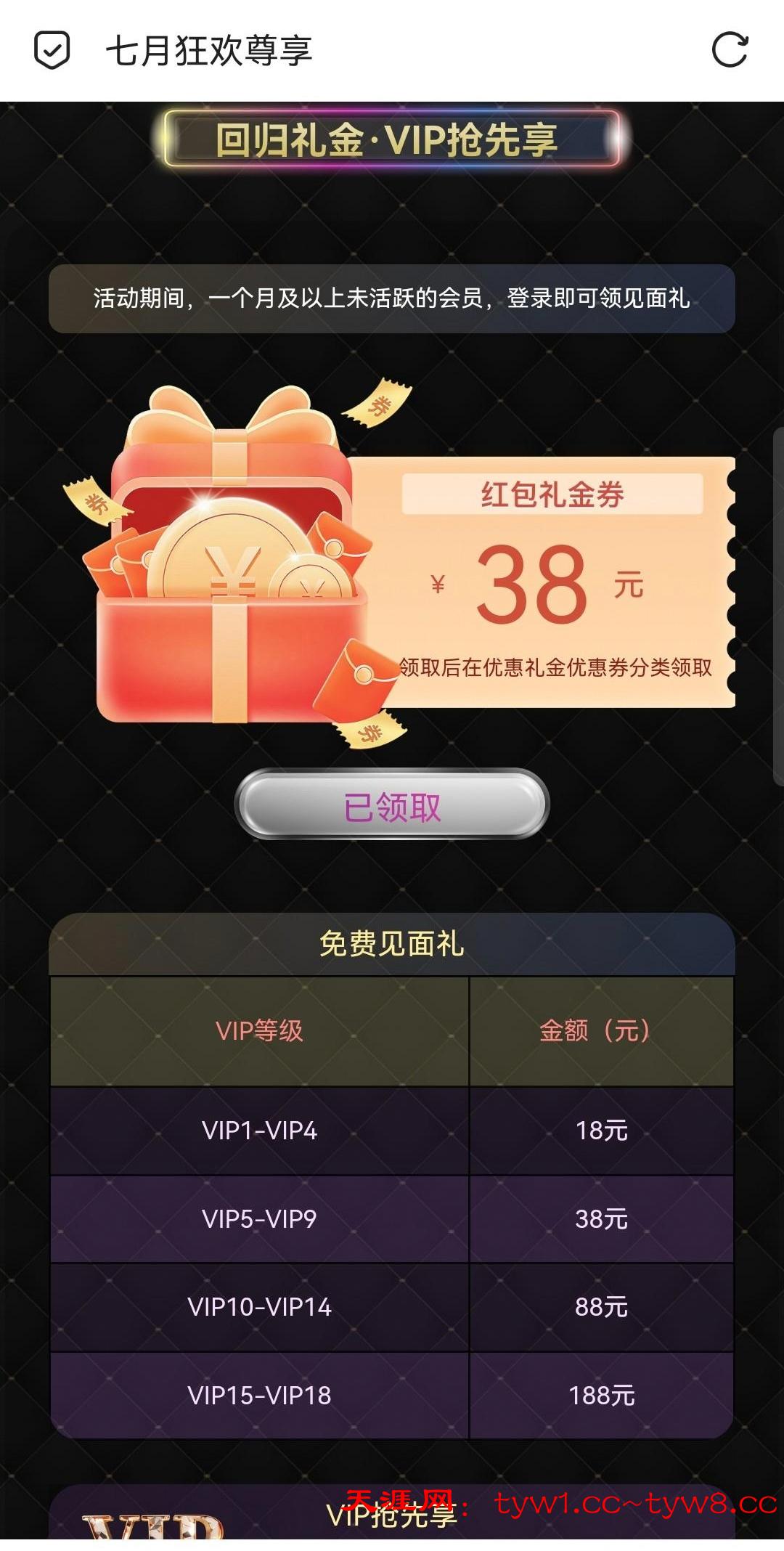 要一个月及以上未活跃的会员登录才有,vip1以上,有符合的去看看,领了38,打死了