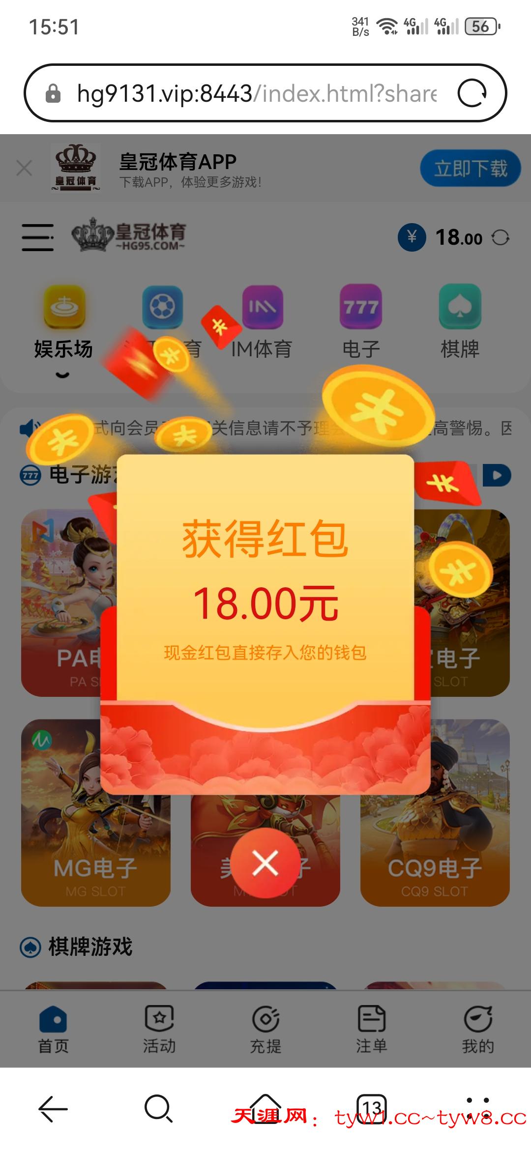 我也是前两天注册的,今天登上去看送了18没打出来。