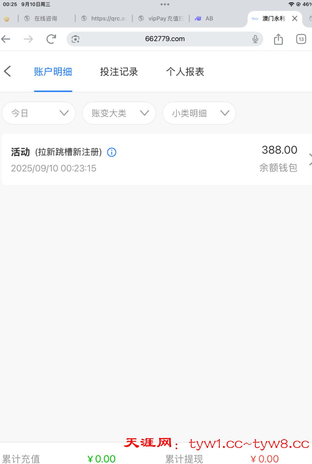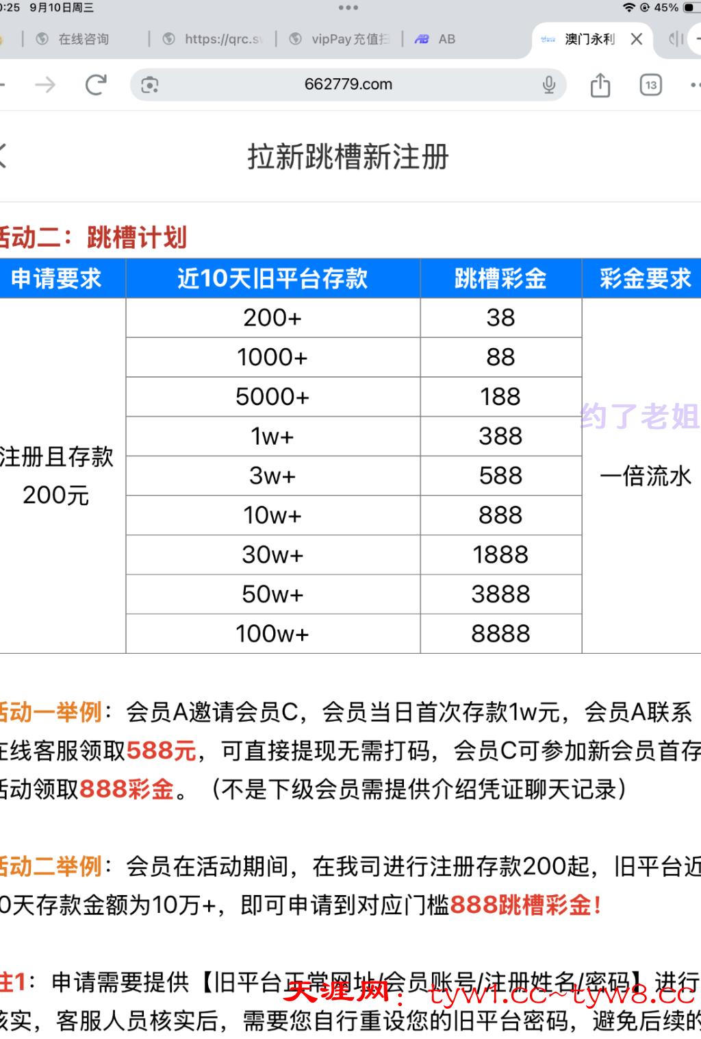 永利出了个新活动,跳槽彩金,需要近期10天内平台充值,达到就可以申请,最近有玩的老哥可以去,我申请到了388,但是打输了,出款自测严谨充值
