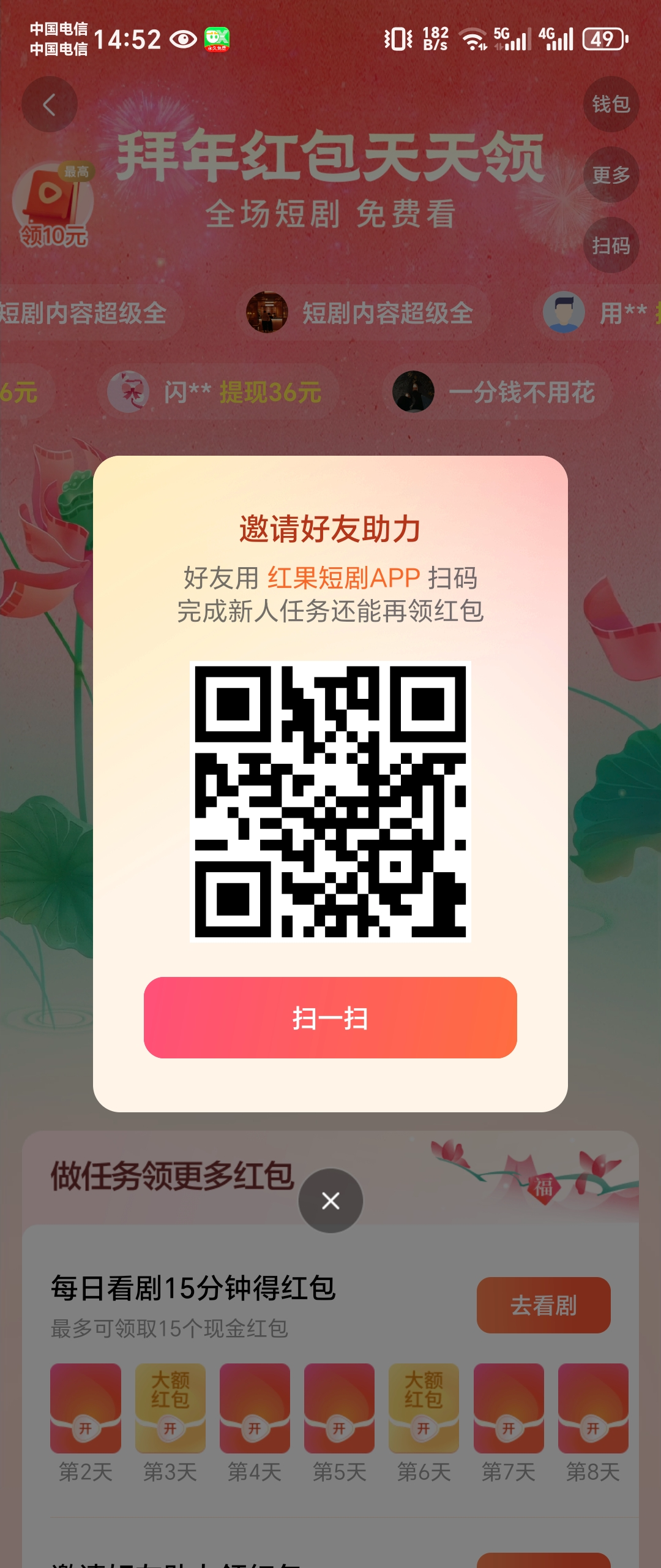 教程:软件城商‬下载《红果短‬剧》app 扫码图2进入活动 拉5-6个人助力就可以直接到账。
