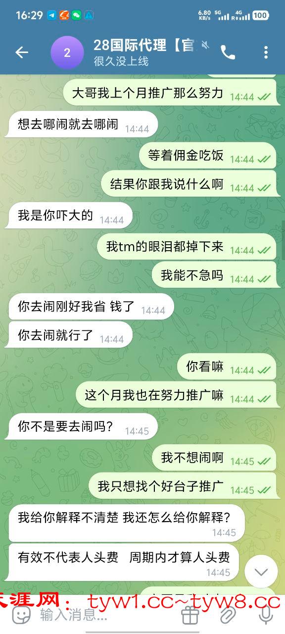 我现在只想在论坛曝光他们,666彩金我也不要了 ,避雷大哥嘛,真心的,无论代理还是玩家都不要去28国际玩,只要去了她家做代理基本就是黑奴,别想给你算佣金算人头费,然后客服也是不要逼脸,我已经放弃希望了。没有选择好平台,在一个垃圾平台把自己做夸了。
