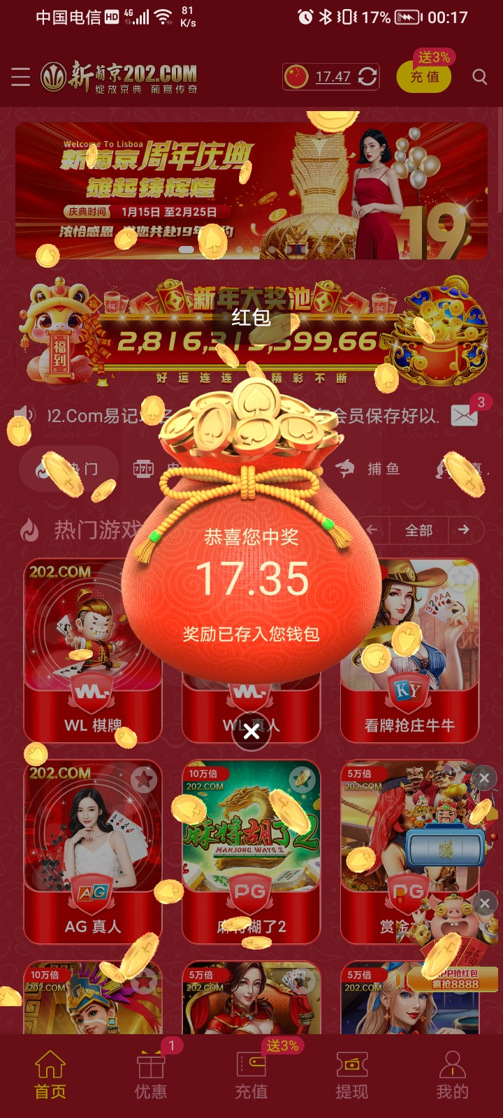 官网202.com就充值一百块,每天过了凌晨十二点登录自动弹出来一个红包,金额随机,最低1块,运气好可以领多点。