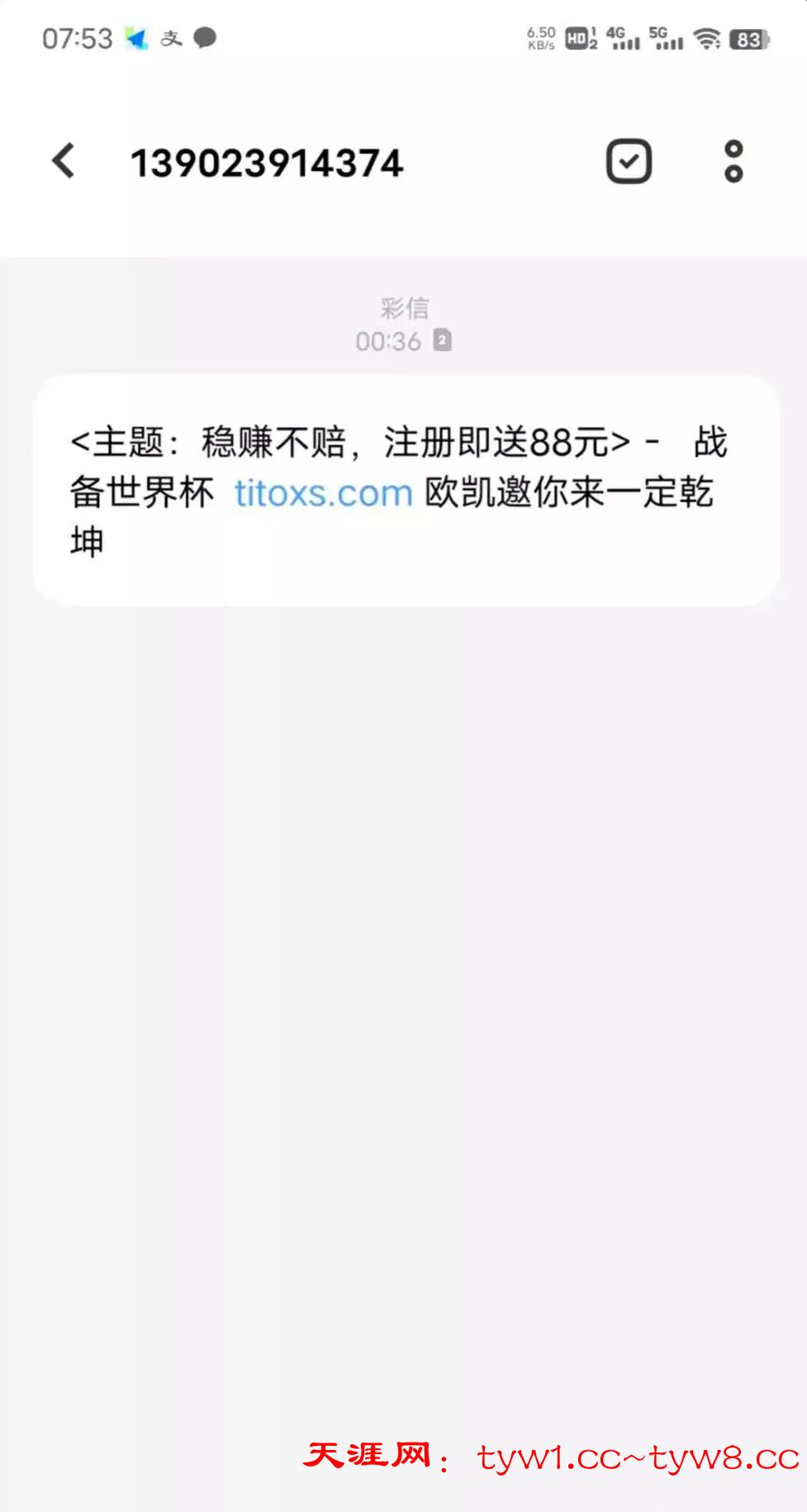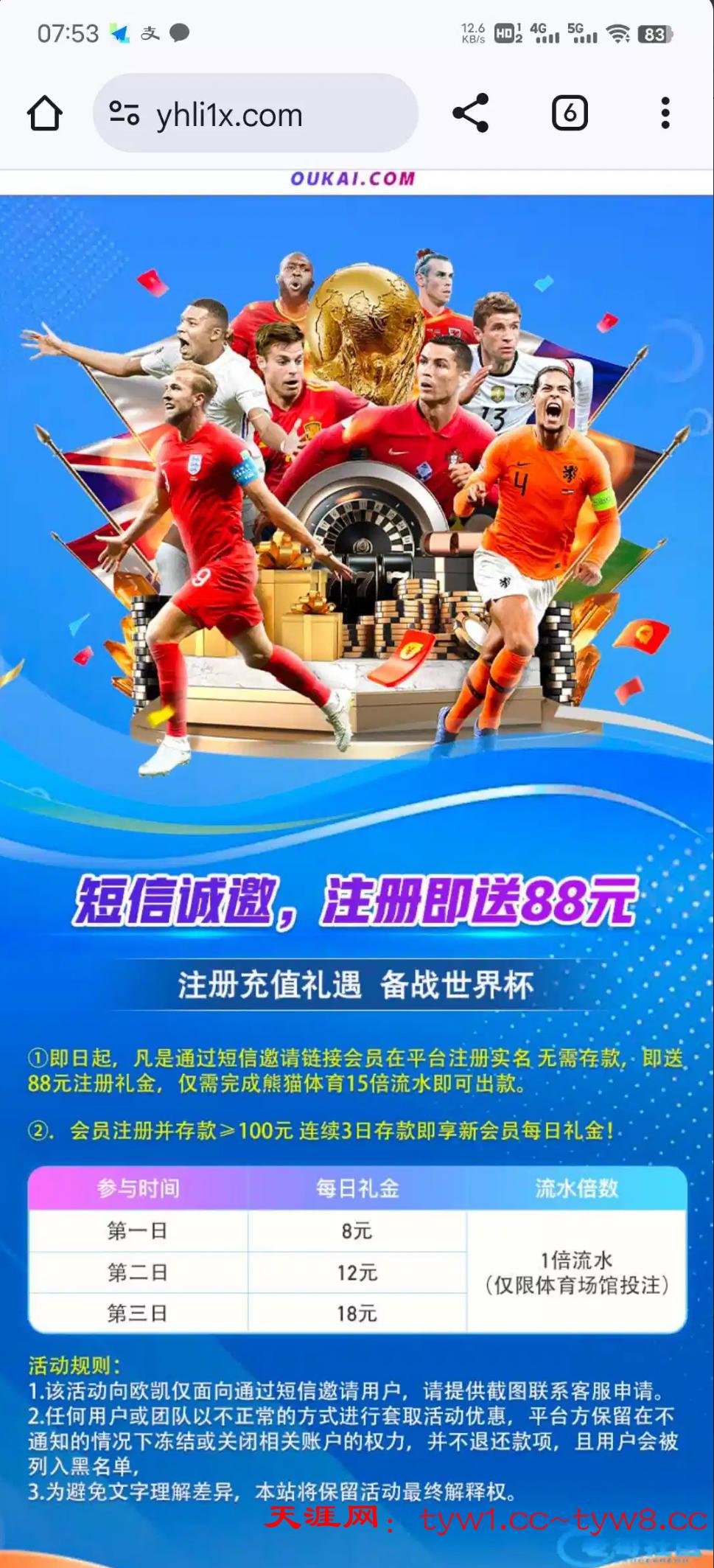 注册送88  注册找客服说领取特邀彩金,88只能打熊猫体育15倍流水,我出了500,开始还以为是黑台,结果提现秒到,应该不需要特邀,我朋友没收到短信注册也送了,必须走短信里面的链接注册才送