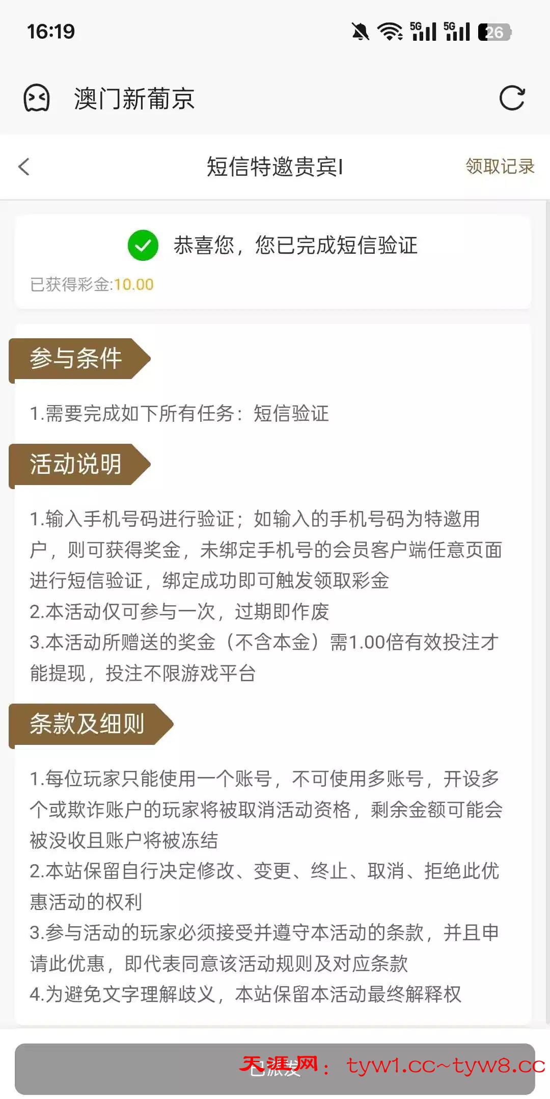 前几天注册过不是特邀,刚刚无聊看一下垃圾短信有这个台进去自助那里自动领取不用短信验证