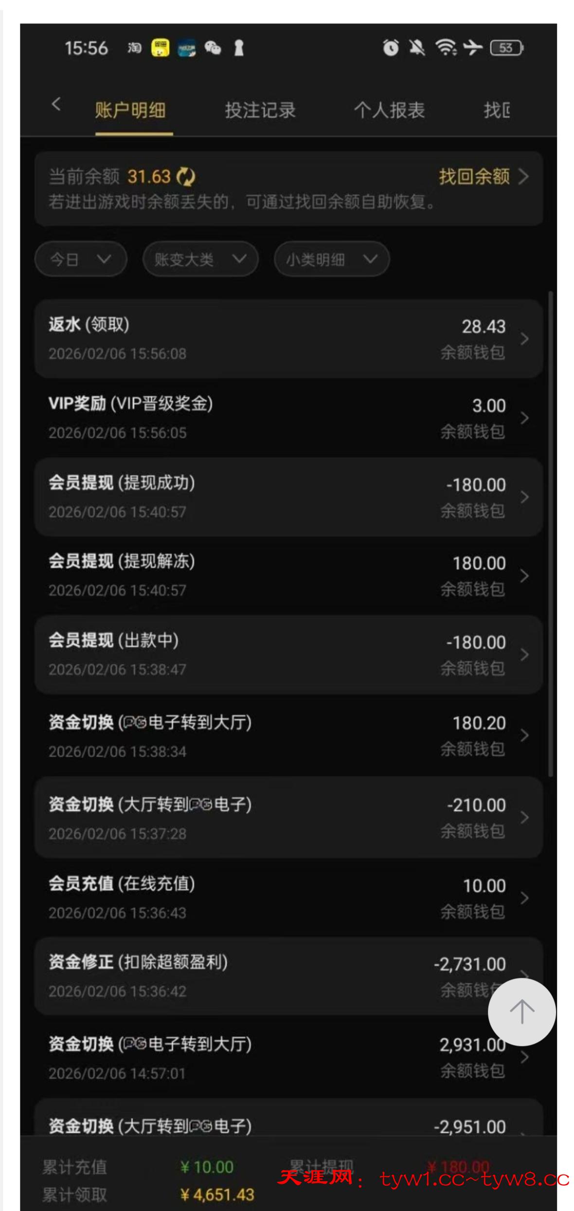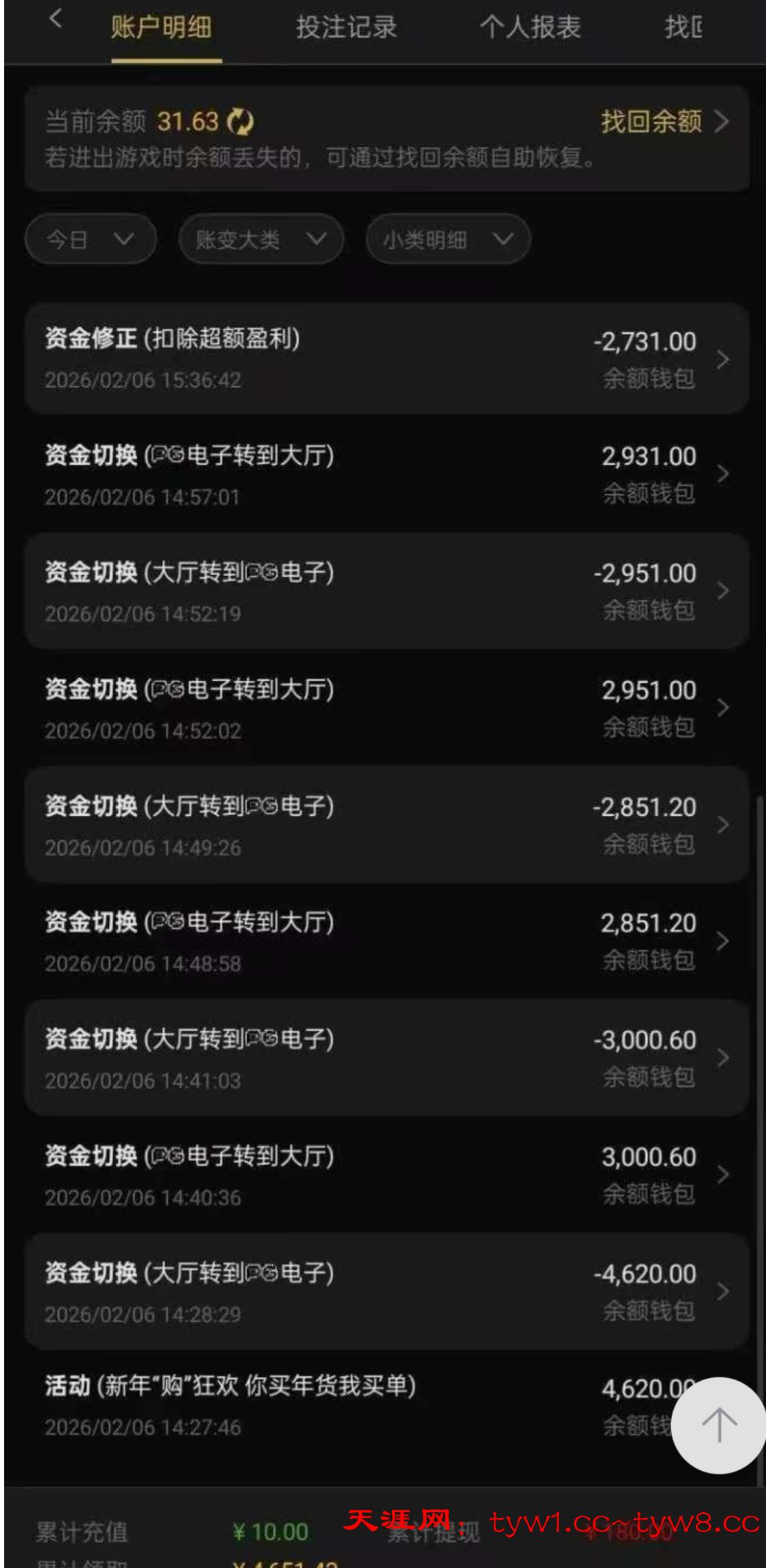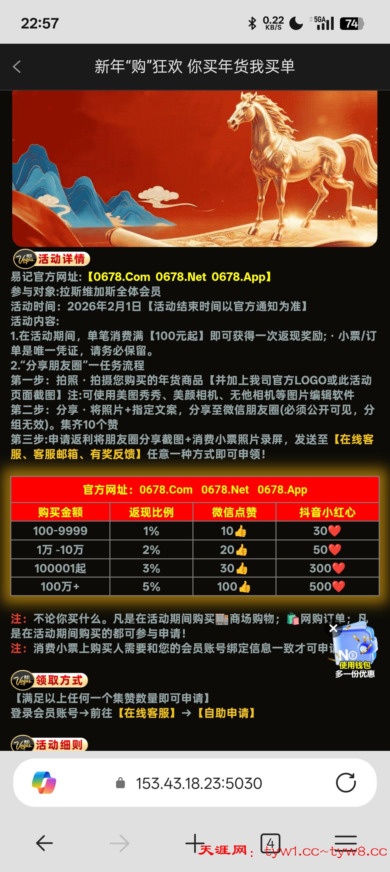 活动里面有一个新年购 你来买 我来买单活动 P假的朋友圈 假的收据 然后提供给在线客服,但是建议大家先充值十块钱 随便刷个流水提现 我是新号 送了4620.打到2931 说我没有充值过 我冲了10块 因为第一次充值,所以超过200盈利都扣了。只给我保留了200块,随便点了两下提了180