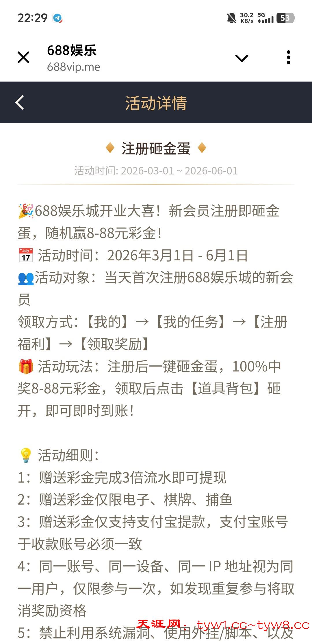 3倍流水即可提款,注册送8-88彩金,满100提款,只能提支付宝链接http://688vip.me