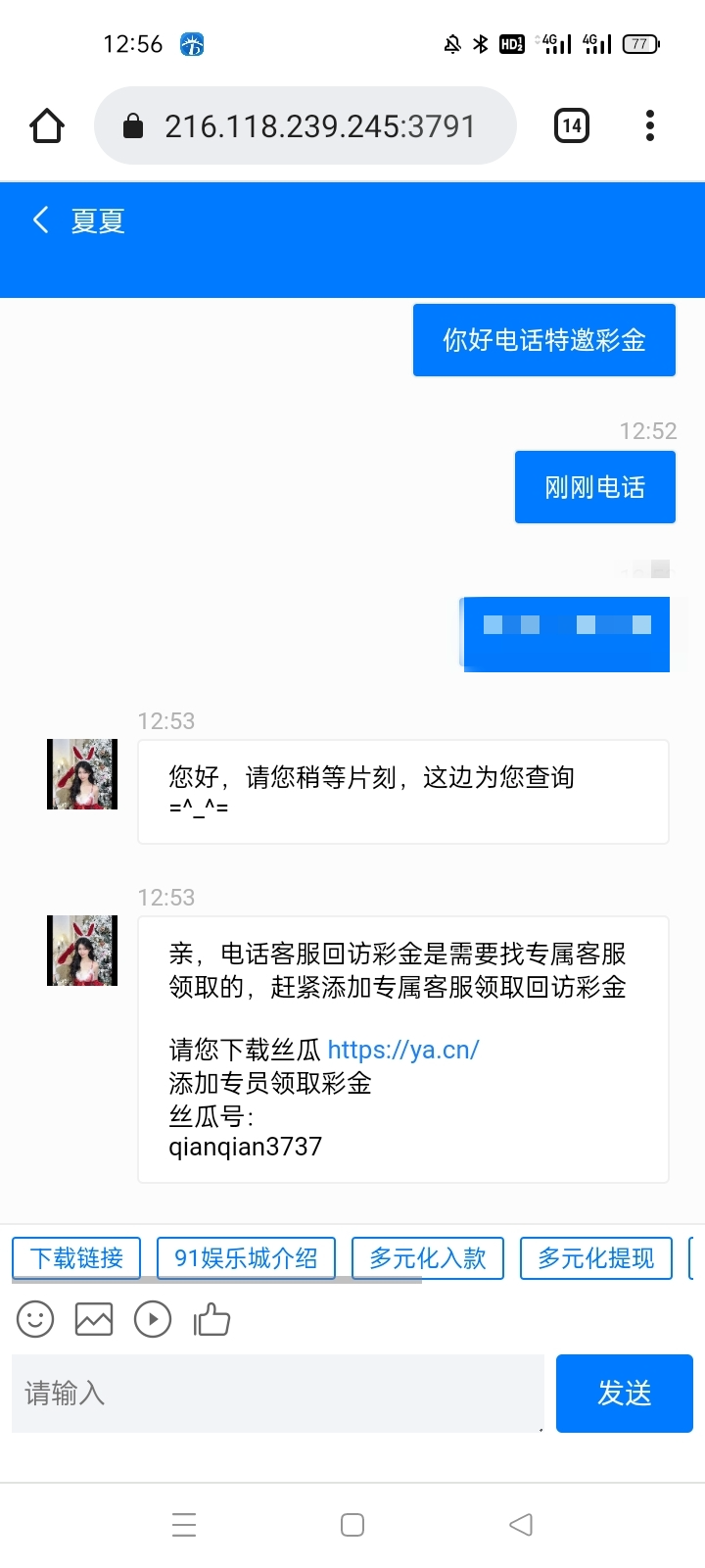 我是接到电话去的,找在线客服直接说电话彩金,客服直接叫你加旺旺,大家可以去碰一下