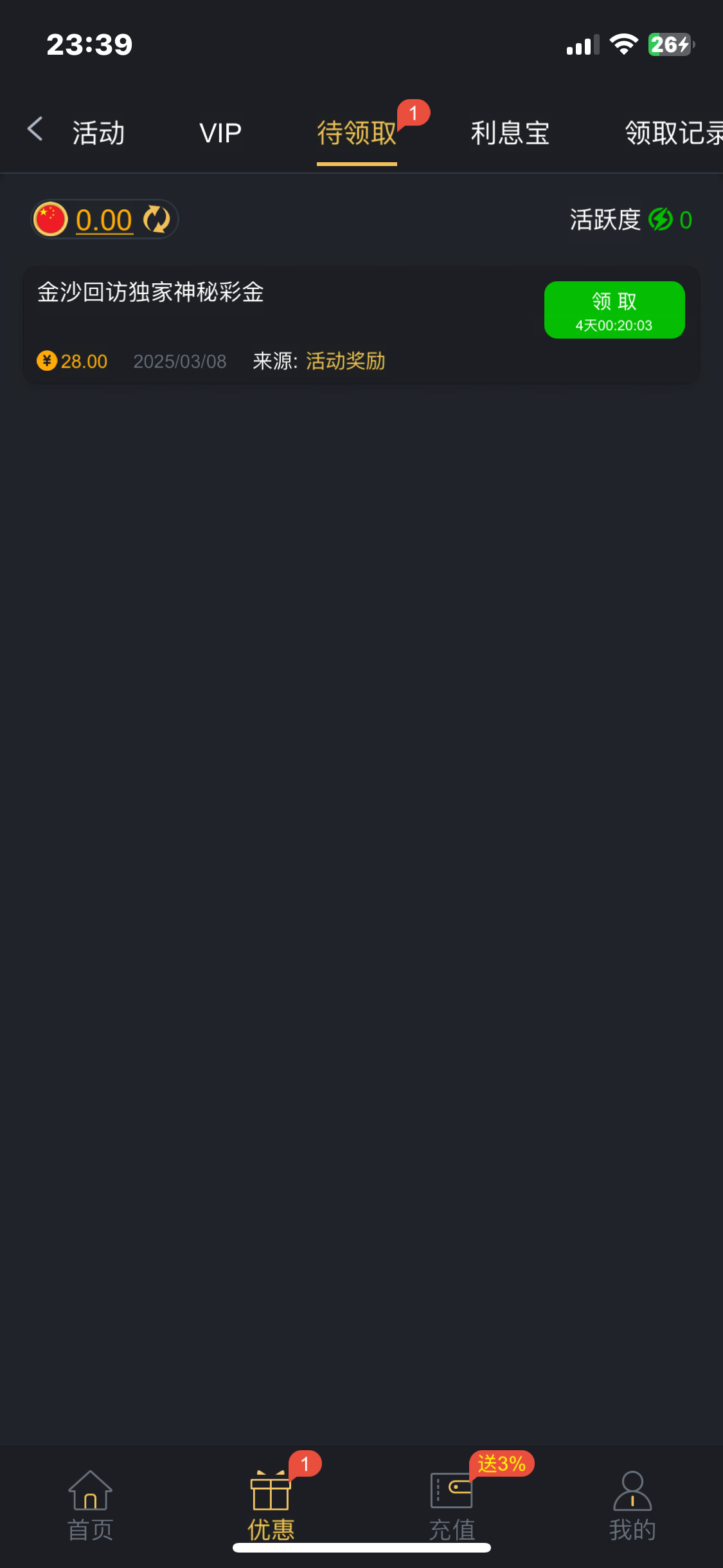 登录就有,勿充值,28上210提100罚我1000流水,白嫖就行,黑台一个!