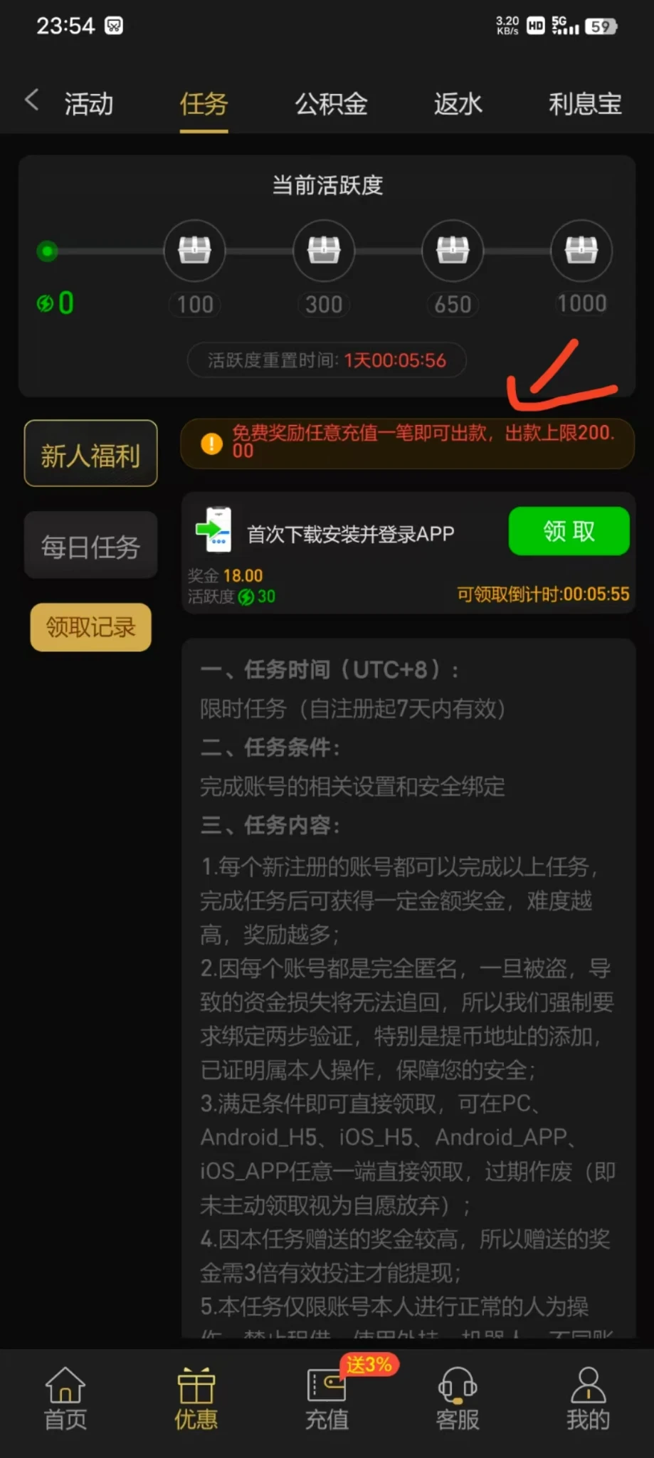 注册下载app在优惠任务自行领取,我已经领到也出款了