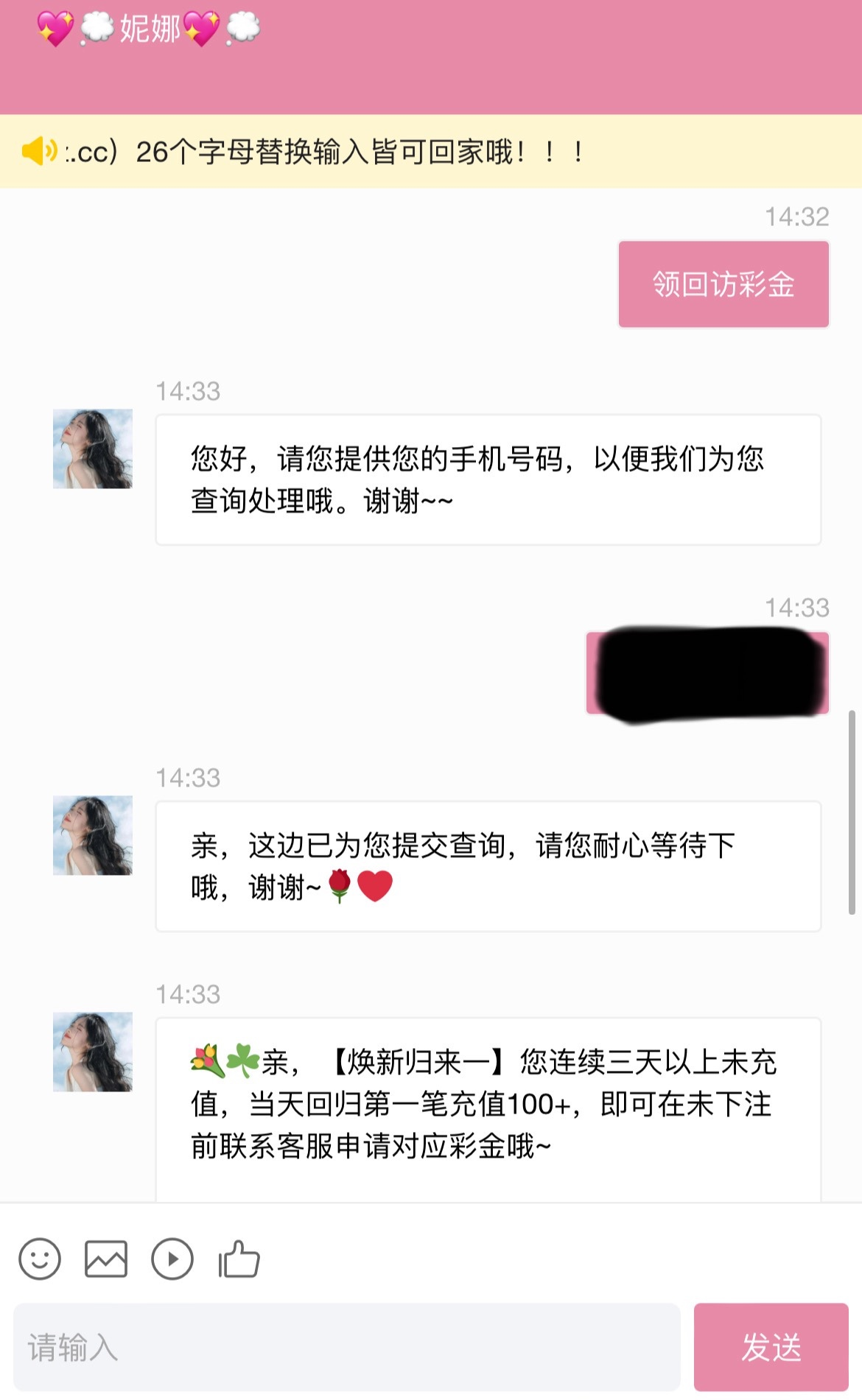 碰瓷电话回访彩金 联系在线客服领发手机号给客服查 没注册过的也可尝试先注册不要绑卡等电话回访