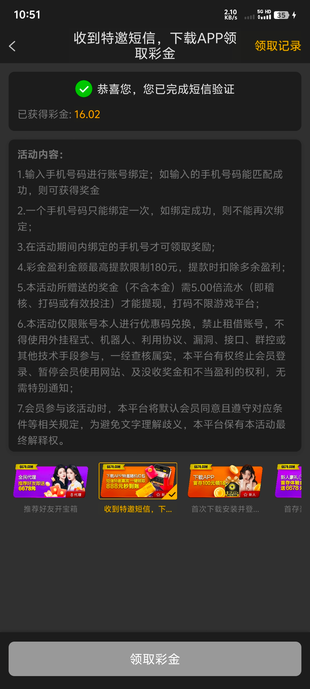 注册在优惠里找到短信特邀活动自助申请,是特邀秒到 彩金限制自行查看平台,有就有没有就无视!