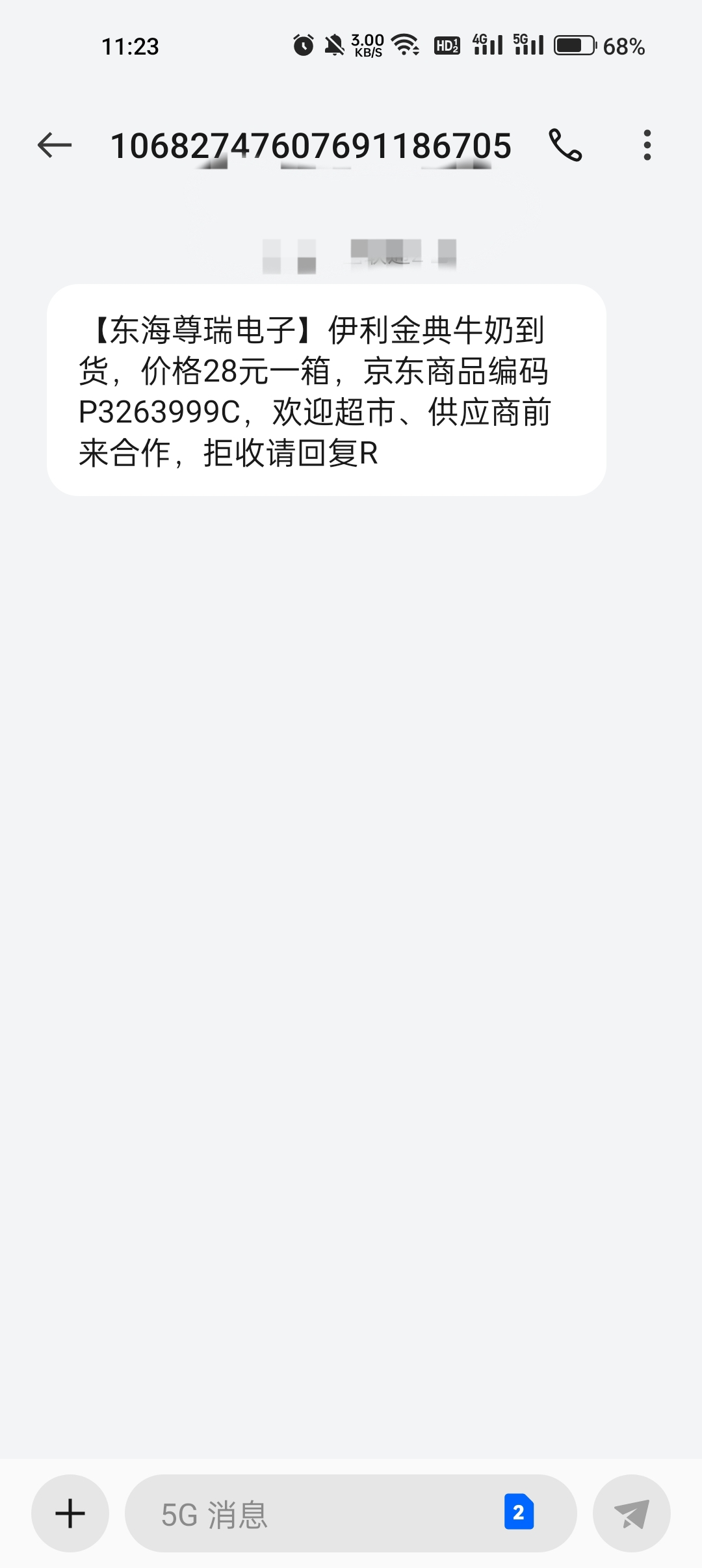 短信模板10682747607691186705【东海尊瑞电子】伊利金典牛奶到货,价格28元一箱,京东商品编码P3263999C,欢迎超市、供应商前来合作,拒收请回复R