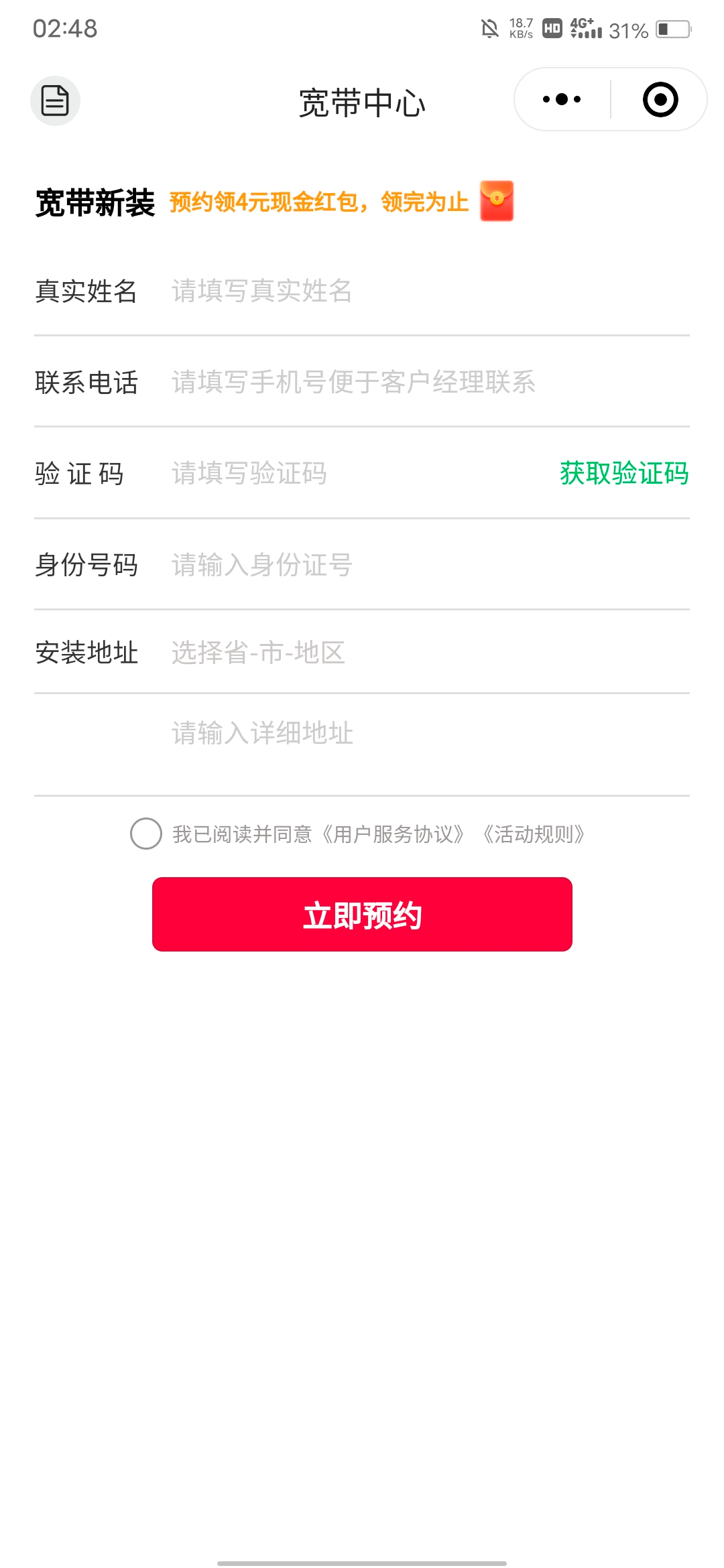 跟支付宝那个红包一样,就是预约一下宽带而已