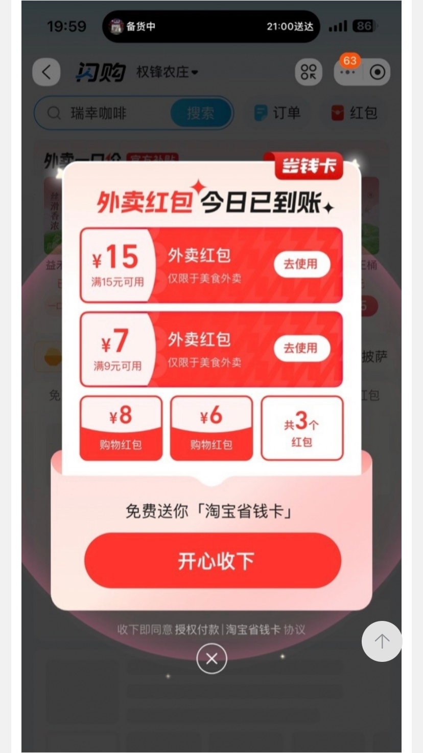 淘宝搜索,闪购,满15-15外卖劵,