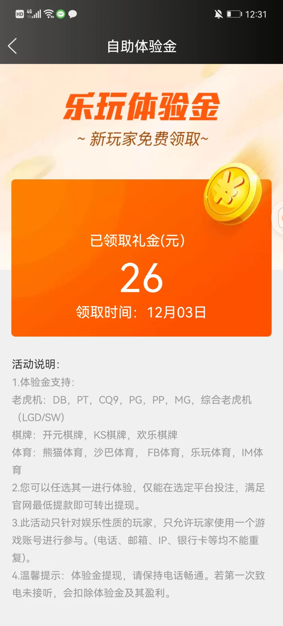 送彩金了,打到400说我不符合要求,彩金全部清空