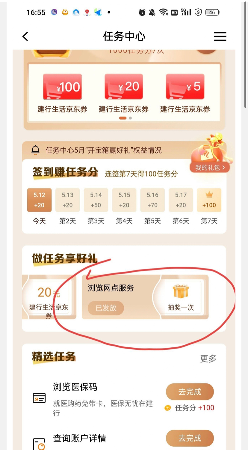 建设银行任务中心这个抽奖 我圈起来了,完成这个浏览任务,直接抽,很多人抽中10立减金,我自己刚中10立减金