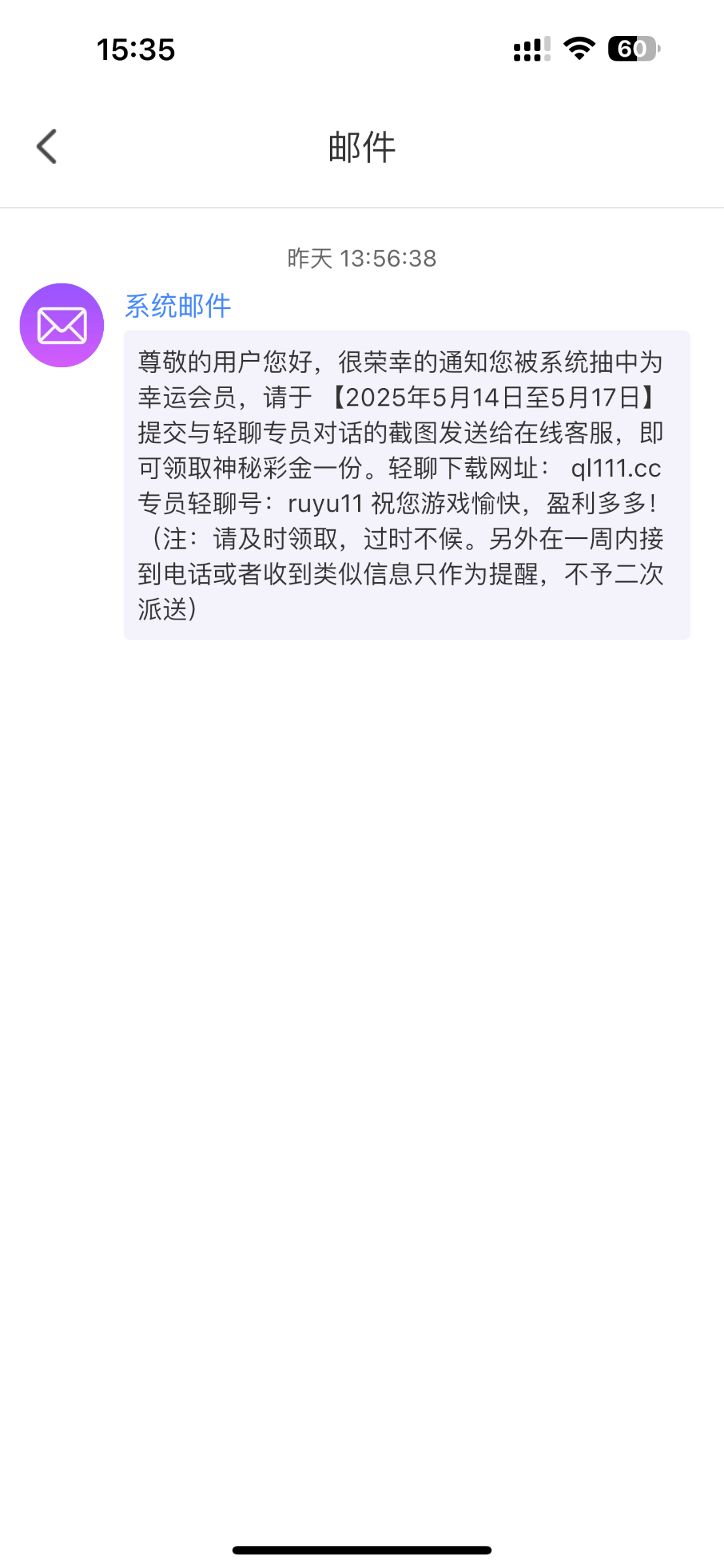 注册过的可以去看看app邮件里有没有这个消息