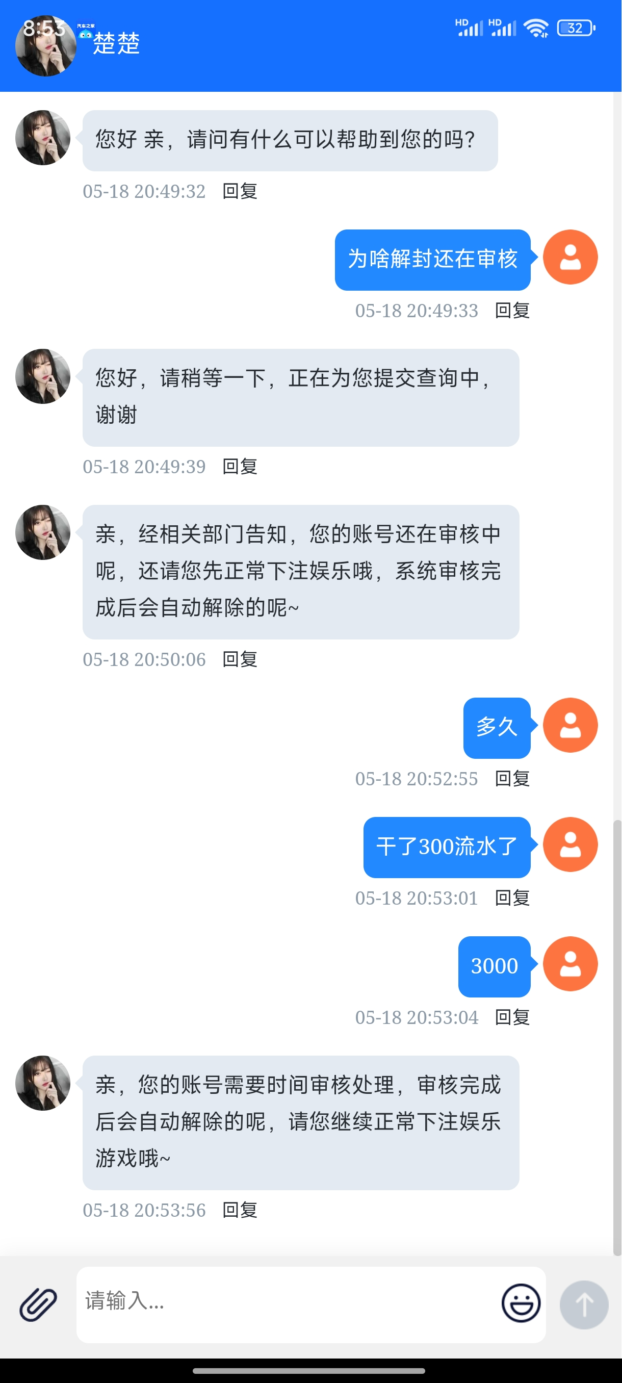 好几个月前参加王者回归存100送38给我拉黑了,今天给我打电话回访彩金,发现可以玩游戏不跟别的台一样黑了就不让我罚了5倍流水打800多流水今天干了3000多流水继续黑,娇涩直播
