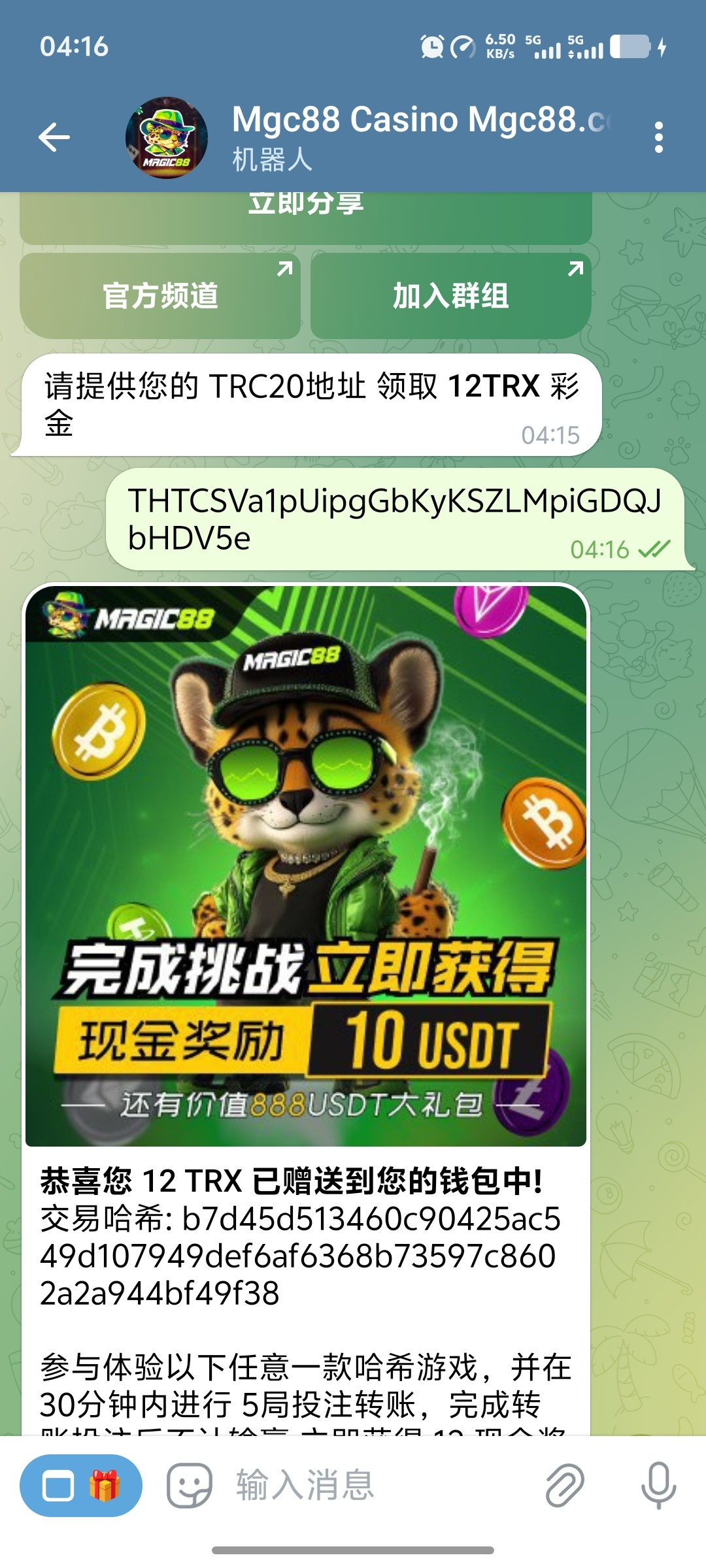 上去发地址就到账12TRX我看了一下价值3u白嫖猪脚饭 挂梯子去平台还有别的活动 下注5把可以领取10U@xongcvtdsawrhbot