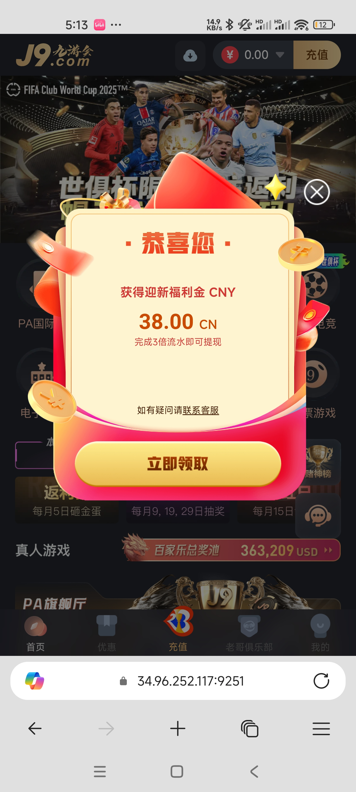 看见论坛帖子说有登录彩金,看模板没注册过,注册了账号,然后立马就接到电话送 38 彩金,三倍流水提,自测!(严禁充值)