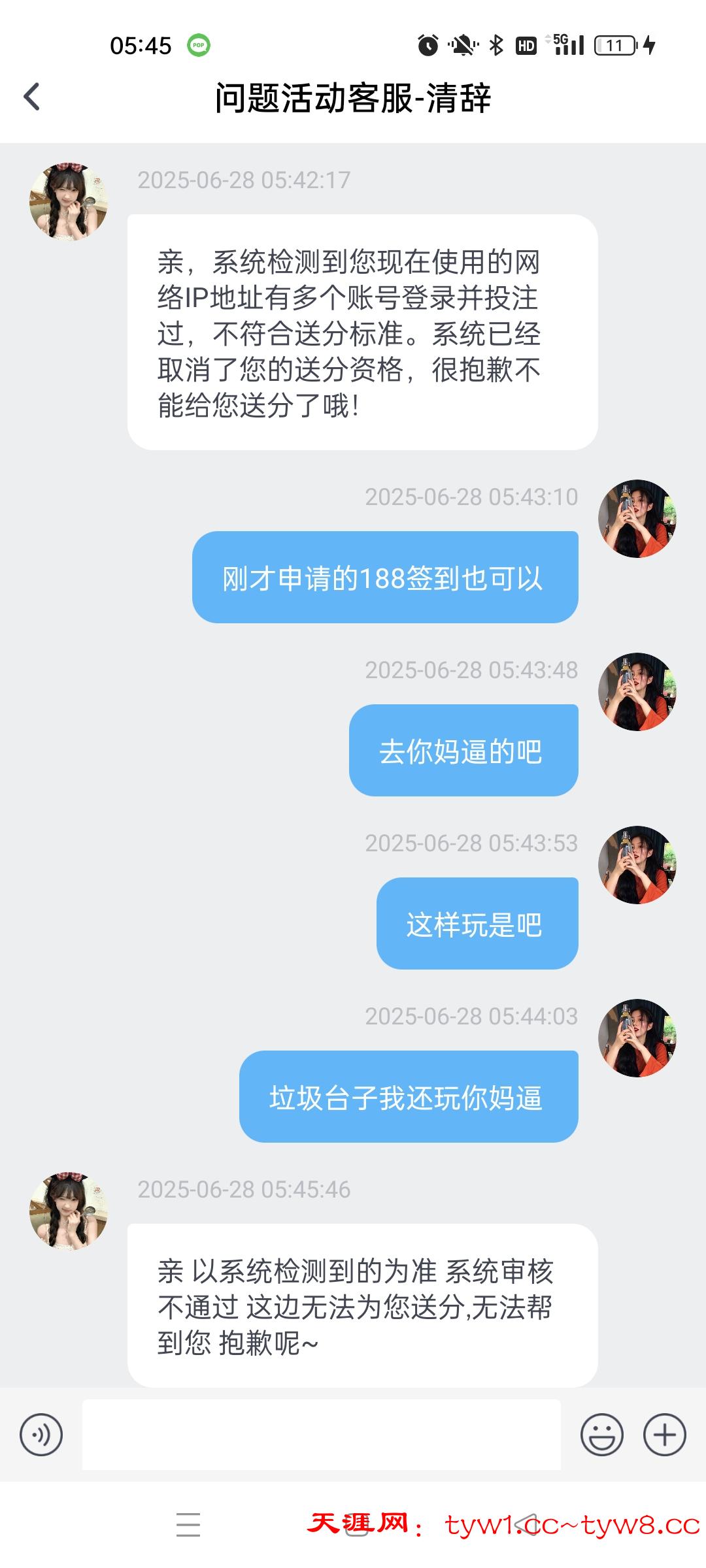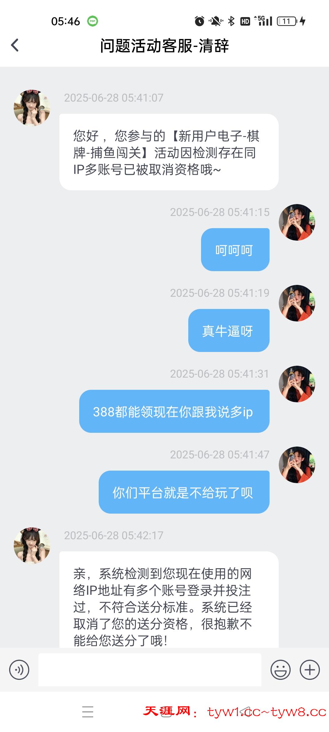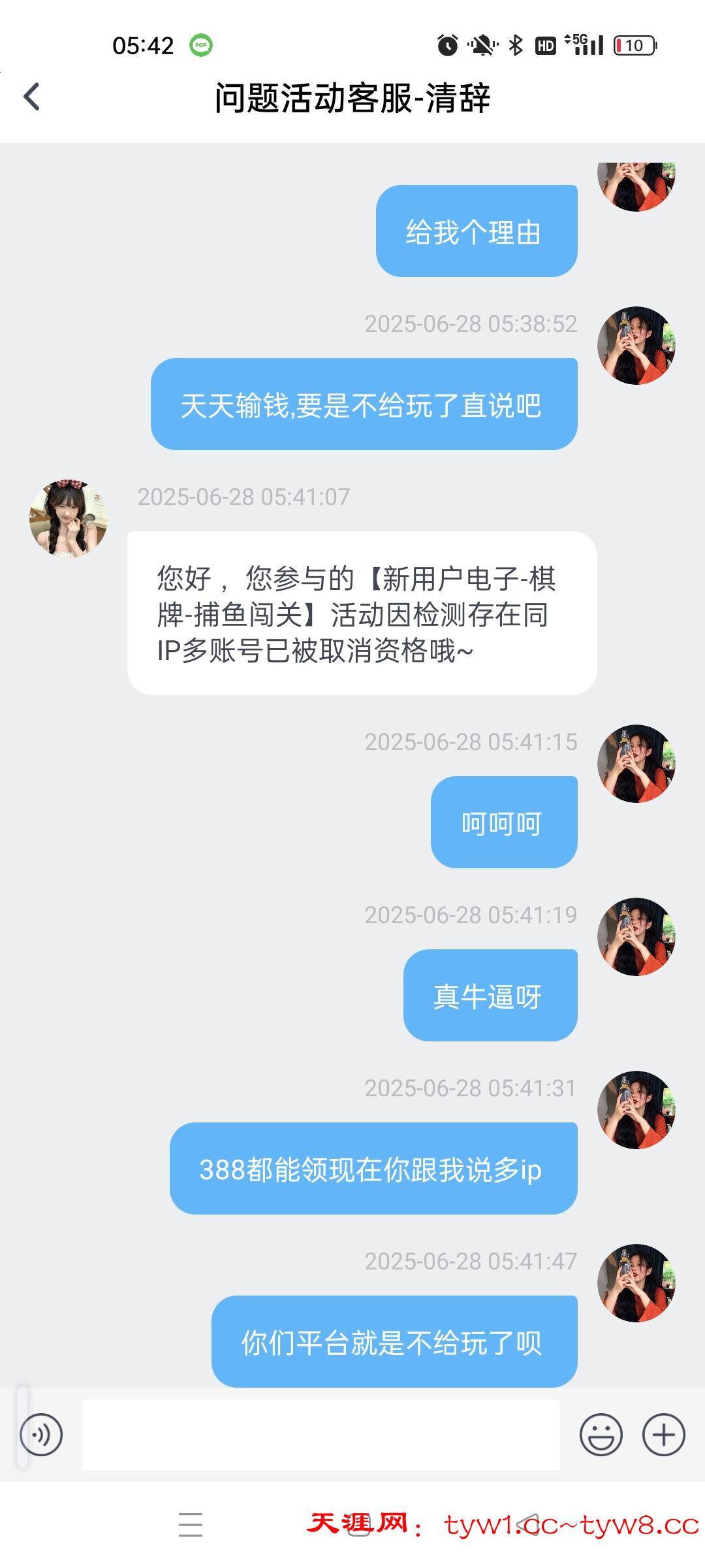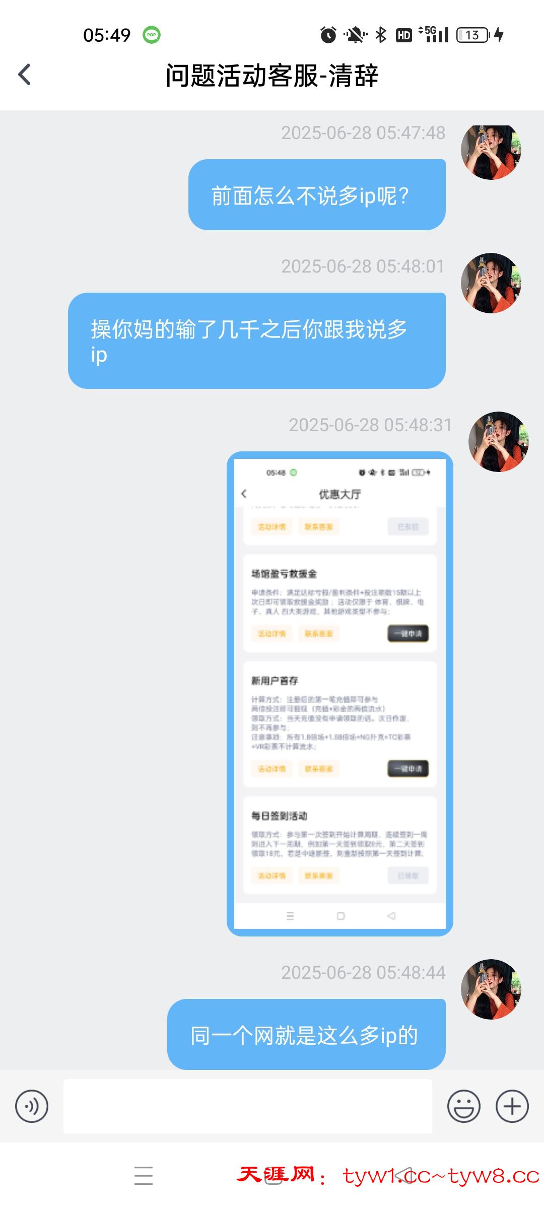 打人头天天充值不过,24过0,天天充值输了几千打码5w流水的彩金388可以领,申请10w流水的688之前申请七天签到的188还给,过一会申请6888直接不给了说多ip全程用的流量,大家自己注意吧