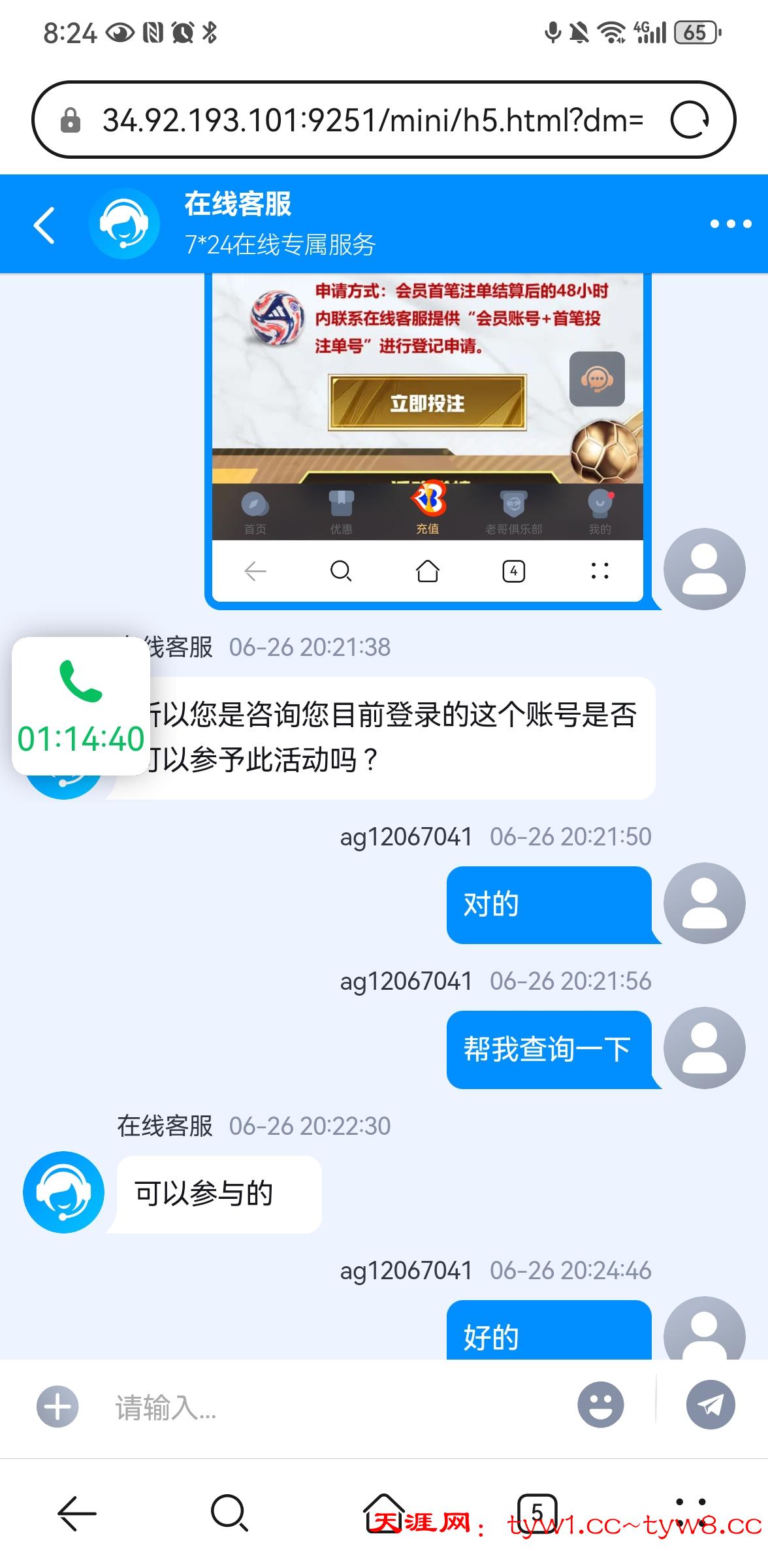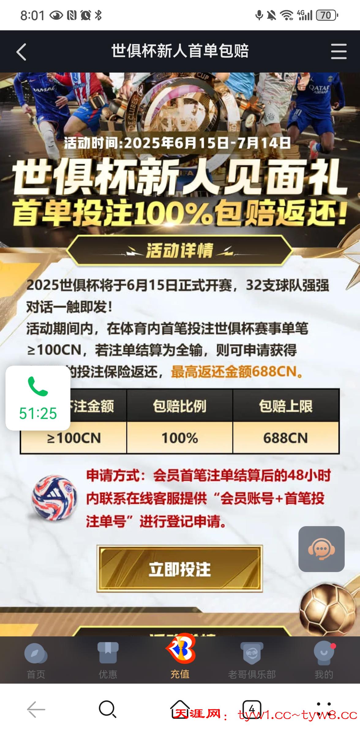 我看到老哥们说九游会注册有38,进去看了,之前注册过账号,然后我翻活动看到一个世俱杯首单包赔活动 最高688, 然后我就参加了,输了之后但是这个彩金一直没派发,打之前还问了客服,客服说符合要求    说的三天内,今天都已经第三天了还是没动静,有老哥参加过这个活动没有,交流一下